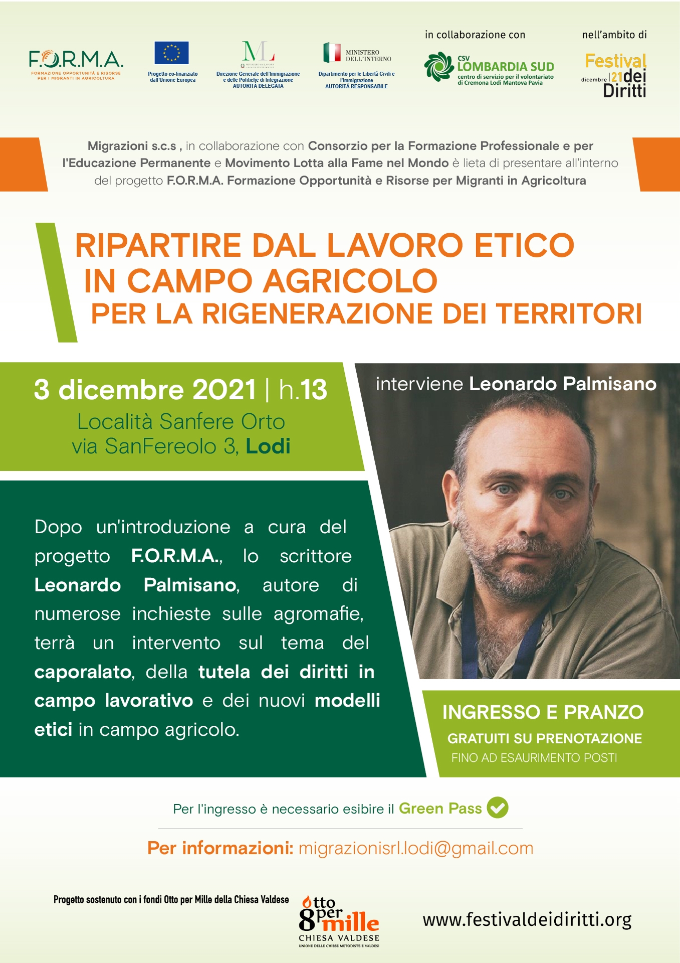 Dopo un'introduzione a cura del progetto F.O.R.M.A., lo scrittore Leonardo Palmisano, autore di numerose inchieste sulle agromafie, terrà un intervento sul tema del caporalato, della tutela dei diritti in campo lavorativo e dei nuovi modelli etici in campo agricolo.